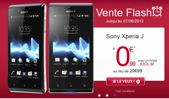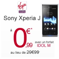 Virgin Mobile met en avant le Sony Xperia J du 04/06 au 07 juin 2013 avec la souscription simultanée à un forfait iDOL M avec un engagement de 24mois. Pour profiter de la réduction immédiate de 29€, vous devez choisir un forfait parmi la gamme IDOL M avec un engagement de 24 mois et indiquer le code promo XPERIAJ lors de la commande. Le mobile est au prix de 29.99€ soit 0.99€ grâce à cette vente flash. La remise est proposée également avec les forfaits iDOL M bloqués, voici la liste des forfaits disponibles avec cette vente flash :