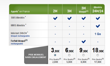 -Nouveau Forfait Bloqué Sim 3h sans engagement à 9.90€ comprend 3h d’appels par mois ainsi que les SMS illimités. Ce dernier peut être rechargé à tout moment, notamment à l’épuisement du crédit avec les recharges prépayées.