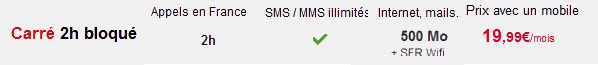 Le forfait Carré 2h bloqué est au prix de 19.99 avec un engagement de 24 mois et comprend :