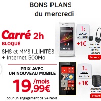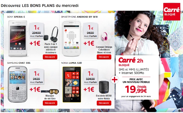 Comme tous les mercredis, SFR propose un bon plan, ce mercredi SFR met en avant le forfait Carré bloqué 2h associé à un mobile parmi 4 modèles. Les mobiles en promotion avec le forfait Carré bloqué 2h sont le Sony Xperia E, le Smartphone Android by SFR, le Samsung Chat 335 et le Nokia Lumia 520. De plus, SFR vous offre pour 1€ supplémentaire un cadeau en fonction du modèle choisi soit un casque ou une enceinte ou encore un masque de ski. Voici ci-dessous tous les détails du bon plan du mercredi chez SFR.