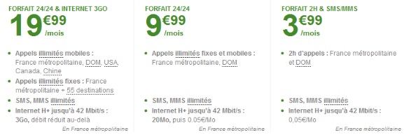 - Le forfait 24/24 internet 3Go H+ comprend les appels illimités vers les fixes et mobiles en France, USA, Canada, Alaska, Hawaï, Chine et DOM (Mayotte inclus), et vers les fixes de plus de 55destinations, SMS/MMS illimités en France et vers les DOM, et un accès Internet jusqu’à 3Go (débit réduit au-delà).