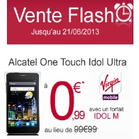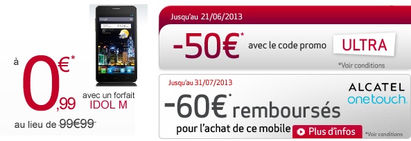 Virgin Mobile met en avant l’Alcatel One Touch idol Ultra avec la souscription simultanée à un forfait iDOL M à partir de 13.99€ avec un engagement de 24 mois. Le mobile est en vente flash jusqu’au 21 juin prochain, vous profitez d’une réduction immédiate de 50€ et un remboursement jusqu’à 60€ par le constructeur Alcatel soit le mobile à 0.99€ (99.99€- 50€ immédiat -49€ différé). Pour profiter de la réduction immédiate, vous devez indiquer le code promo « ULTRA » lors de la commande et pour le remboursement différé valable jusqu’au 31 juillet 2013 , vous devez compléter et renvoyer le coupon avec la liste des pièces demandées.