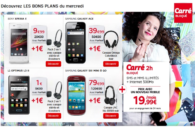 SFR propose un bon plan tous les mercredis, on retrouve ce mercredi 19 juin, 4 modèles de mobiles en baisse associé à la souscription à un forfait Carré bloqué 2h. Les mobiles en promotion avec le forfait Carre bloqué 2h sont le Sony Xperia E, le Samsung Galaxy Ace, le LG Optimus L3 II et le Samsung Galaxy S3 Mini 8Go. SFR vous offre pour 1€ supplémentaire un casque et/ou écouteurs en focntion du modèle. Voici ci-dessous tous les détails du bon plan du mercredi chez SFR.