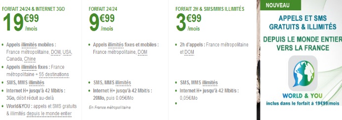 - Le forfait 24/24 à 9.99€ comprend les appels illimités vers les fixes et mobiles en France et les mobiles vers les DOM/COM (Mayotte inclus), SMS/MMS illimités en France et vers les DOM et un accès Internet jusqu’à 20Mo (au-delà facturé 0,05€/Mo).
