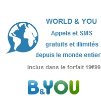 B&You opérateur Low Cost de Bouygues Telecom a annoncé, il y a quelques jours un nouveau service pour le forfait illimité à 19.99€ pour vos appels et sms depuis le Monde entier vers la France. Cette nouvelle option est gratuite et disponible dès aujourd’hui en téléchargeant l’application « World & YOU ». Cette nouvelle option permet d’appeler et envoyer des SMS en illimité depuis le Monde entier vers la France en utilisant une connexion Wifi. Ce nouveau service arrive au bon moment pour ceux qui partent à l’étranger pour les vacances d’été ou encore pour ceux qui voyagent régulièrement ou se trouvant en zone frontalière.