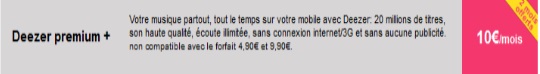 A l’occasion de la fête de la musique qui se déroulera partout dans le monde dans quelques jours, Sosh vous offre l’option musique Deezer Premium +. Cette dernière est offerte depuis le 13 juin 2013 pendant 2 mois pour toute souscription à un forfait mobile Sosh. C’est donc l’occasion de profiter et de tester ce service pendant 2 mois, l’option est valable uniquement avec un forfait avec de la data soit à partir de 19.90€. Cette option est facturée 10€ par mois et permet de bénéficier de la musique partout, tout le temps sur votre mobile mais aussi sur votre ordinateur ou votre tablette.