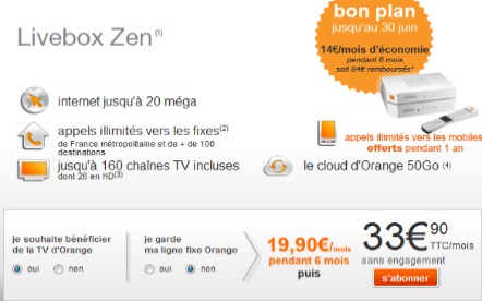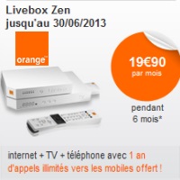 La Livebox Zen ADSL ou Fibre chez Orange est en promotion pendant 6 mois, l’offre vous revient à 19.90€ au lieu de 33.90€, pour toute souscription jusqu’au 30 juin inclus. Vous économisez 14€ par mois soit 84€ sur 6 mois, de plus les appels illimités vers les mobiles sont offerts pendant 12 mois avec cette formule puis facturés 5 euros/mois. L’offre de remboursement* est différée, vous devez donc compléter et renvoyer le coupon avant le 30 septembre 2013.
