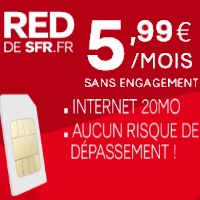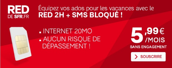 SFR propose la gamme série Red, des forfaits mobiles 100% en ligne sans engagement à partir de 4.99€. Vous cherchez à équiper vos ados, optez pour le forfait bloqué RED de SFR, un des moins cher du marché actuellement. En effet, le forfait bloqué Red est au prix de 5.99€ avec ou sans achat de mobile. Avec ce type de formule, vous maitrisez votre budget car pas de dépassement possible et vous êtes libre de changer de formule ou d'opérateur à tout moment.