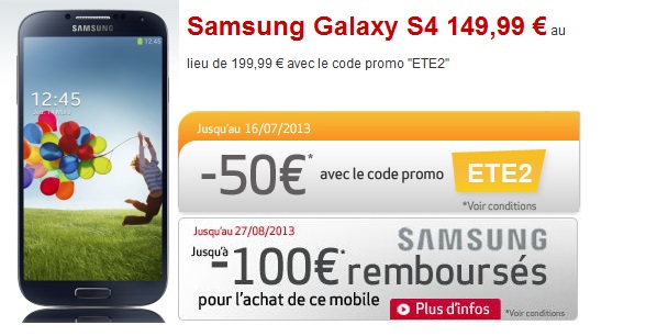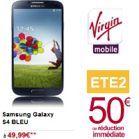 Le Samsung Galaxy S4 est en promotion chez Virgin Mobile à 49.99€ au lieu de 99.99€ jusqu’au 16 juillet 2013, alors dépêchez-vous il ne vous reste plus que quelques heures pour profiter de la remise immédiate de 50€. Virgin Mobile offre également un remboursement jusqu’à 100€ pour l’achat de ce modèle jusqu’au 27/08/13 ( soit 199.99€ - 100€ différé -50€ immédiat). Pour bénéficier des remises pour l’achat du Samsung Galaxy S4, vous devez souscrire au forfait iDOL XL à 39.99€ avec un engagement de 24 mois. Pour la remise immédiate de 50€ à la commande, il suffit de renseigner le code promo « ETE2 », et pour l’offre de remboursement différé jusqu’à 100€, vous devez remplir le formulaire sur le site de Virgin Mobile dans les 30 jours suivants l’activation de votre ligne.
