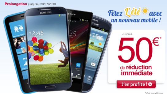 - Le Samsung Galaxy S4 est au prix de 149.99€ au lieu de 199.99€ € (code promo « ETE2 »). De plus, vous bénéficiez d’un remboursement différé jusqu’à 100€ soit le mobile à 49.99€,