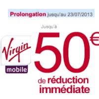 Virgin Mobile prolonge l’opération spéciale été jusqu’au 23 juillet 2013. Vous profitez jusqu’à 50€ de remise immédiate sur 8 téléphones mobiles. Les modèles concernés sont le Samsung Galaxy Ace 2, Galaxy S3 Mini, Galaxy Mega, Nokia Lumia 620, Sony Xperia Z, Blackberry Z10, et l'Alcatel Idol Ultra. Pour bénéficier de la remise immédiate vous devez souscrire à un forfait iDOL XL ou un forfait parmi la gamme iDOL M et indiquer le code promo « ETE1, ETE2, ETE3 » en fonction du modèle.