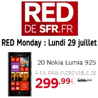 SFR commercialise les offres RED 100% en ligne, la gamme RED est composée de 4 forfaits mobiles sans engagement à partir de 4.99€. Pour la période des vacances d’été, l'opérateur lance une opération spéciale Monday et donne la possibilité aux abonnés RED d’acheter un Smartphone dernier cri à un prix incroyable. La semaine dernière, SFR a vendu 20 Galaxy Note II 4G à ses abonnés, l’opérateur renouvelle l’opération aujourd’hui lundi 29 juillet avec cette fois le Nokia Lumia 925. Ce dernier est au prix incroyable de 299.99€ au lieu de 599.99€.