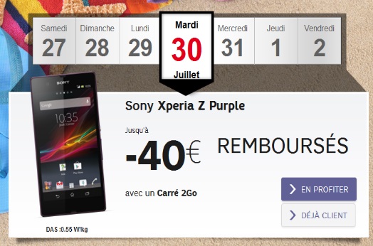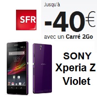 L’opération Summer Deals chez SFR se poursuit, et ce jusqu’au 01 Août 2013, chaque jour, vous profitez d’une remise sur un modèle parmi la gamme des téléphones portables. Après le Blackberry Curve 9320, c’est le Sony Xperia Z Purple qui est mis en avant aujourd’hui 30 juillet avec la souscription simultanée à un forfait Carré 2Go, vous bénéficiez d’une remise immédiate de 40€. Le mobile est au prix de 249.99€ soit 209.99€ grâce à la remise immédiate de 40€ et 109.99€ avec le remboursement différé de 100€ valable jusqu’au 26 Août prochain.