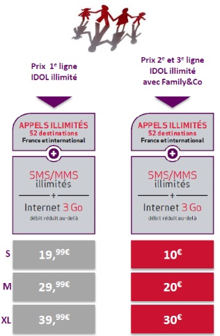 Grâce à l'offre Famille&Co, vous pouvez profiter de 3 forfaits illimités (appels, SMS, MMS, et 3Go de Data) sans engagement à 40€ seulement ( 19.99€ le premier forfait et le deuxième et 3éme forfait à 10€). Cette réduction de 9.99€ sur le deuxième et troisième forfait est valable désormais avec les forfaits M et XL.Pour bénéficier de l’avantage Family&Co, il suffit de remplir un formulaire web, une fois la ligne activée.