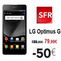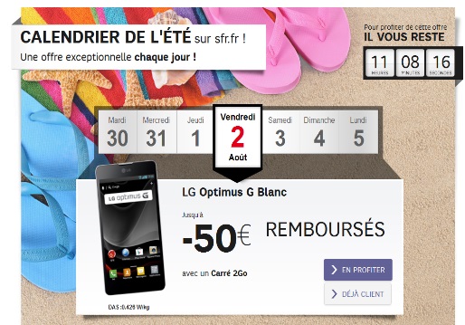 L’opération Summer Deals de SFR continue, vous profitez chaque jour d’une réduction sur un Smartphone, cette opération lancée le 30 juillet se termine le 05 Août 2013. Le deal d’aujourd’hui 2 Août 2013 concerne l’achat d’un LG Optimus G Blanc avec un forfait Carré 2Go. SFR vous offre 50€ de remise immédiate, le mobile est au prix de 199.99€ soit 149.99€ avec la réduction immédiate et 9.99€ avec le remboursement différé de 0€ valable jusqu’au 26 Août prochain.