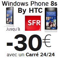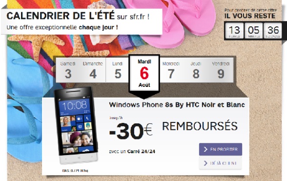 L’opération Summer Deal se poursuit chez SFR, le deal du jour concerne le HTC Windows Phone 8S avec la souscription simultanée à un forfait Carré 24/24. Le mobile est à 69.99€ soit 39.99€ grâce à la remise immédiate de 30€ et 9.99€ avec le remboursement différé de 30€ jusqu’au 26 Août 2013.