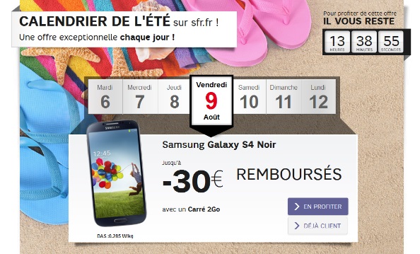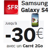 Le Summer Deal du jour chez SFR concerne le Samsung Galaxy S4 avec la souscription simultanée à un forfait Carré 2Go. Le mobile est à 269.99€ soit 239.99€ grâce à la remise immédiate de 30€ et 189.99€ avec le remboursement différé de 50€ jusqu’au 26 Août 2013.