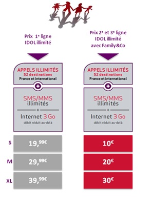 - Le forfait IDOL M à 29.99€ par mois pour de l'illimité sans engagement avec un smartphone à prix réduit -> 20€ par ligne supplémentaire.