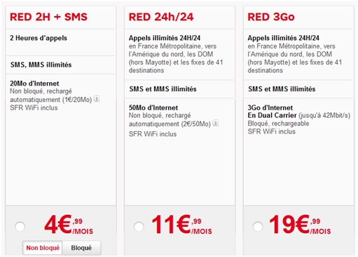 - Série RED 24/24 3Go contient les appels illimités fixes et mobiles en France, Amérique du Nord et DOM (hors Mayotte) et vers les fixes de 41destinations, ainsi que les SMS/MMS illimités et Internet jusqu’à 3Go en H+ (rechargeable) à 19,99€/mois.