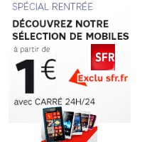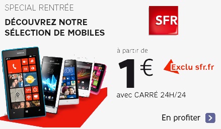 SFR propose une opération spéciale rentrée permettant de bénéficier d’un smartphone à 1€ avec la souscription simultanée à un forfait Carre 24/24 avec un engagement de 24 mois. Les mobiles concernés sont le Nokia Lumia 520, Lumia 610, Sony Xperia E, Xperia U, et le HTC Windows Phone 8S.