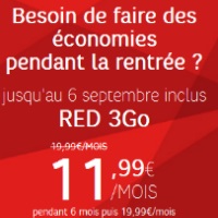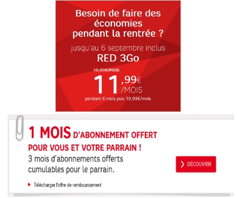 SFR a lancé une opération le 27 Août dernier pour la souscription à un forfait Red illimité à 19.99€. En effet, vous profitez d’une réduction pendant 6 mois sur le prix du forfait jusqu’au 06 septembre prochain. Le forfait 24/24 3Go est au prix de 11.99€ au lieu de 19.99€, dépêchez-vous, il ne vous reste plus que 2 jours pour en profiter. De plus, SFR propose une offre de parrainage jusqu’au 23 septembre prochain, 1 mois offert pour le parrain + un mois offert pour le filleul dans la limite de 3 parrainages par parrain, sous condition que la ligne soit toujours active à la date d'examen du dossier.
