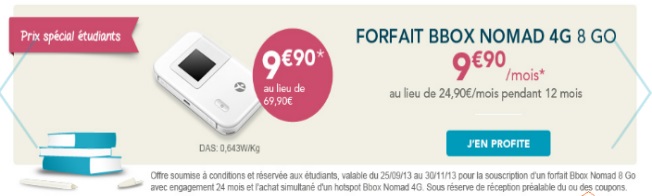 -Le forfait Bbox Nomad 4G 8Go est au prix de 9.90€/mois pendant 12 mois au lieu de 24.90€ et soumise à un engagement de 24 mois. Cette offre est valable du 25 septembre au 30 novembre 2013. Vous profitez en plus d’un mois offert pour toute souscription avec ou sans engagement entre le 1er octobre et le 17 novembre.