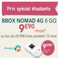 A l’occasion du lancement de son réseau 4G en France, Bouygues Telecom lance une opération spéciale étudiant. Au 01 octobre l’opérateur couvre 63% de la population en 4G et pour permettre aux étudiants de se connecter à internet en mobilité, Bouygues Telecom propose un nouveau forfait Bbox Nomad 8Go à un prix exceptionnel de 9.90€ par mois. Pour promouvoir cette opération, Bouygues Telecom ira à la rencontre des étudiants sur 60 campus de France du 25 septembre au 15 octobre 2013. Voici plus de détail sur cette formule.
