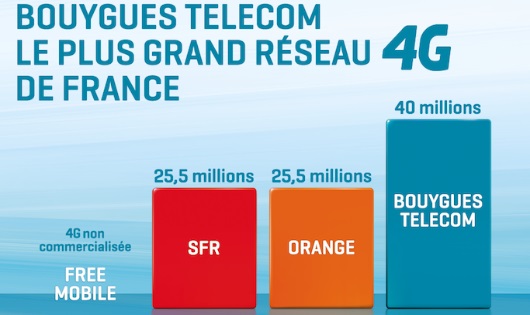 Bouygues Telecom est le seul à avoir obtenu un accord par l’ARCEP afin d’exploiter un réseau de quatrième génération (4G) à la norme LTE (très haut débit mobile), dans la bande 1800 MHz sur laquelle n’est autorisée à ce jour que la seule norme GSM (2G). Il détient donc un avantage par rapport à ses concurrents SFR et Orange qui couvriront d’ici la fin de l’année 40% de la population. De plus, pour ceux qui disposent d’un iPhone 5, il vous suffit de télécharger la dernière version iOS7 pour capter la 4G avec Bouygues Telecom.