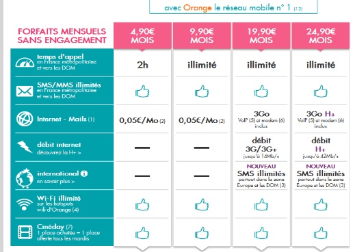 - Le forfait illimité 3Go H+ avec les appels, SMS, MMS illimités, Internet jusqu’à 3Go en H+ (débit réduit au-delà) et les SMS illimités en déplacement depuis l’Europe et Dom au prix de 24.90€.