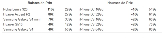 - L’iPhone 5S 16Go augment de 20€ soit 659€ au lieu de 639€, le5S 32 Go passe à 759€ au lieu de 739€, et le 5S 64Go passe à 859€ au lieu de 839€.