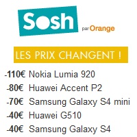 Sosh va baisser le prix d’une sélection de mobiles dès demain le 10 octobre 2013, cependant les prix des iPhone 5C et 5S augmentent. De plus, l’opérateur lance l’opération de reprise de votre ancien mobile jusqu’au 24 octobre 2013 pour l’acquisition d’un iPhone. Les Smartphones qui baissent de prix sont le Nokia Lumia 920, le Huawei Accent P2 et G510, le Samsung Galaxy S4 et S4 mini. Les prix des iPhone 5C et 5S augmentent de 10€ à 20€ en fonction des modèles.