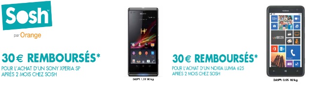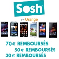 Sosh opérateur Low Cost d’Orange propose des nouvelles offres de remboursement sur une sélection mobiles. Les réductions allant de 30€ à 70€ sont valables pour toute souscription à un forfait mobile Sosh et jusqu’au 20 novembre prochain. Pour en profiter, vous devez rester client au moins 2 mois chez l’opérateur à compter de l’envoi complet des pièces justificatives. Voici les mobiles concernés et les prix avec les offres de remboursement différés.