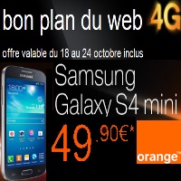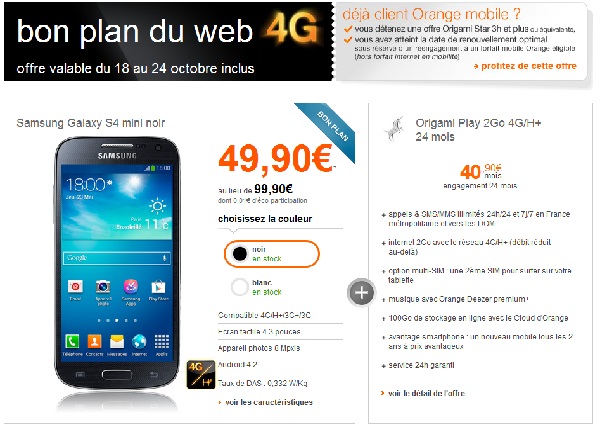 Orange propose le Samsung Galaxy S4 Mini en vente flash du 18 au 24 octobre prochain avec la souscription simultanée à un forfait Origami Play 2Go 4G. Le mobile est au prix de 49.90€ au lieu de 99.90€. Le S4 Mini est disponible à 119.90€ avec le forfait Origami Play 4G 2Go sur 12 mois au prix de 46.99€.