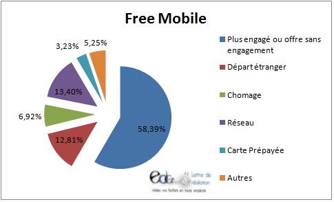 Rappelons que les forfaits mobiles Free sont des offres sans engagement et c’est donc la principale raison des résiliations chez Free à 58.39%. Les clients Free Mobile peuvent donc à tout moment résilier leur abonnement téléphonique sans frais. Le 2éme motif est la résiliation pour incident de réseau avec 13.40% des abonnés, Free Mobile met tout en œuvre pour améliorer le réseau et déployer son propre réseau sur le territoire français. Pour rappel l’opérateur utilise leur propre réseau sur 45% du territoire français et le reste est assuré par le réseau Orange.
