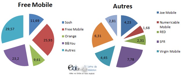 Les abonnés Free sont plus nombreux à se diriger vers B&You opérateur Low Cost de Bouygues Telecom avec 23.2% et 11.69% vers Sosh opérateur Low Cost d’Orange. Virgin Mobile récupère 4.45% des abonnés Free et Joe Mobile 4.23%. Ces derniers proposent des offres sans engagement à des tarifs aussi attractifs que chez Free. On retrouve d’ailleurs chez ces opérateurs des forfaits illimités avec peu ou sans internet entre 9€ et 9.99€, qu’on ne trouve pas chez Free « offre à 2€ avec 2h d’appels ou offre tout illimité avec 3Go à 19.99€ ». Les abonnés qui quittent Free se tournent principalement vers les opérateurs Low Cost à plus de 35%.