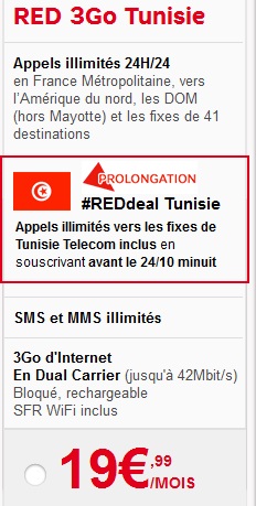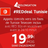 SFR propose une opération #REDdeal depuis quelques mois, ce dernier vous offre des remises exceptionnelles ou encore des services supplémentaires avec les forfaits RED sans engagement. Le dernier bon plan entre le 14 et 20 octobre concerne les appels illimités vers fixes de la Tunisie, l’opérateur a décidé de prolonger cette promotion jusqu’au 24 octobre prochain. Pour toute souscription au forfait RED 3Go à 19.99€, les appels vers les fixes de la Tunisie sont illimités et sont valables jusqu’au 31 décembre 2014.