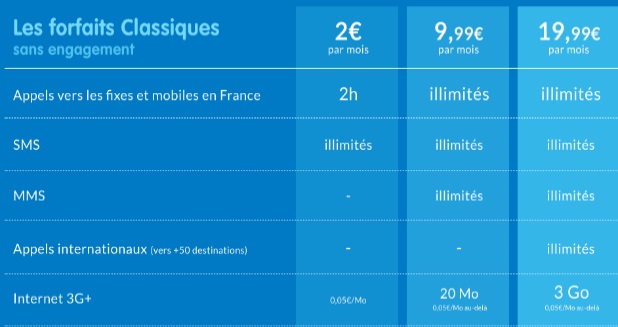- Palier 3 change et passe de 9.99€ à 11.99€ avec les appels, SMS et MMS illimités et un accès Internet de 50Mo au lieu de 100Mo,