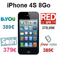 -L’iPhone 4S 8Go est au prix de 389€ chez B&YOU opérateur Low Cost de Bouygues Telecom. Le paiement du mobile est possible en 1 ou 3 fois sans frais ou à crédit Cofidis sur 12 ou 24 mois. La gamme B&YOU est composée de 4 forfaits mobiles à partir de 2.99€ jusqu’à 24.99€.