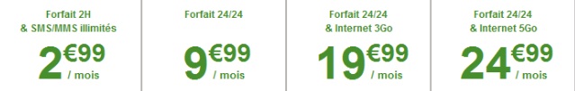 - Le forfait 2H + SMS à 2.99€, ce dernier comprend 2h d’appels par mois ainsi que les SMS et MMS illimités. Il est possible d’ajouter la nouvelle option 100Mo à 1€.