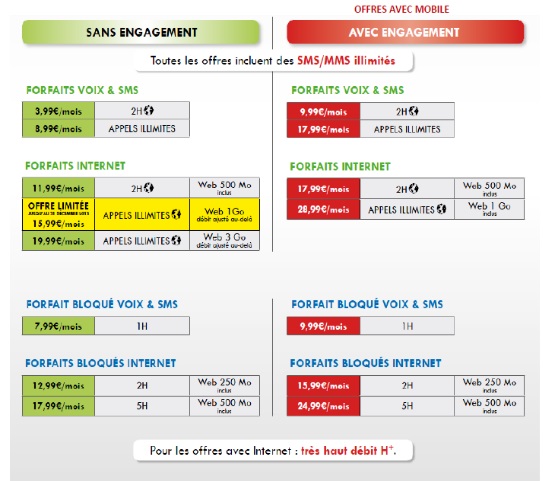 - 28.99€ (offre de lancement et limitée) avec les appels illimités et un accès Internet de 1Go