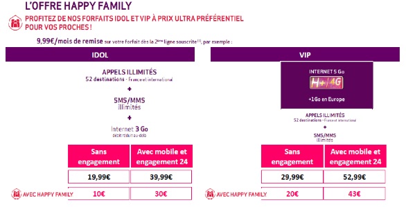 Un client ayant souscrit à plusieurs forfaits tout illimité (même RIB) peut bénéficier de l’avantage Happy Family à -9,99€ sur sa 2e et sa 3e ligne.