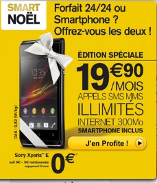 - Ce forfait mobile comprend les appels, SMS et MMS illimités ainsi qu’un accès Internet de 500Mo en h+ (débit réduit au-delà). Disponible avec un engagement de 12 ou 24 mois et achat de mobile à 19.90€ par mois. Vous profitez d’un Smartphone à 0€ tel que le Sony Xperia E avec cet abonnement.