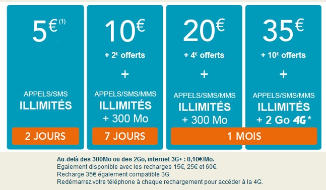 La recharge compatible 4G est disponible dans la formule 24/24 d’un montant de 35€. Cette dernière est valable 1 mois et intègre les appels, SMS et MMS illimités en France et un accès Internet avec un volume de 2Go en 4G. Au-delà des 2Go, vous profitez d’un accès internet 3G+ à 0,10€/Mo.