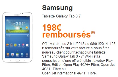 Vous profitez dune offre de remboursement jusqu’à 100€ pour l’achat de la tablette Samsung Galaxy Tab 3 pour toute souscription à une offre Livebox Play ou Open Play 4G Adsl soit la tabletteà 99€ et jusqu’à 198€ remboursés pour l’achat de la Galaxy tab 3 pour toute souscription à une offre Livebox Play en Fibre ou Open Play 4G Fibre soit la tablette à 1€. Cette offre est valable entre le 21 novembre 2013 et le 08 janvier 2014.