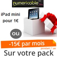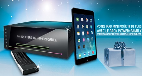 Pour toute souscription à un pack Power + Family entre le 07 novembre 2013 et le 19 janvier 2014, Numericable vous livre un iPad Mini Wifi 16Go pour 1€ de plus à condition d’être éligible aux offres par le câble. La procédure est simple, vous recevez un coupon de participation par email à compléter et à renvoyer par courrier avec la liste des pièces demandées (un chèque d’un montant de 1€ et la copie des 2 premières factures. Une fois le dossier validé vous recevrez dans un délai de 3 mois l’iPad mini - Wi-Fi 16Go. L’offre est réservée aux 5000 premiers clients. L’iPad ne pourra pas être déposé au pied du sapin compte tenu des délais de traitement. Cette promotion reste tout de même intéressante pour ceux qui cherchent à investir dans une tablette haut de gamme et bénéficier d’un accès très haut débit au domicile.
