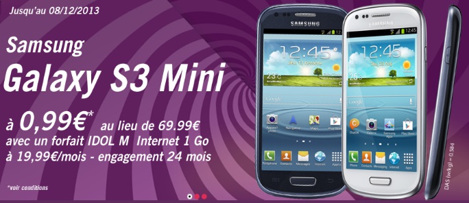 Grâce à la remise immédiate de 69€ en indiquant le code promo « S3MINI », le mobile vous revient à 0.99€ au lieu de 69.99€. La réduction s’applique avec les forfaits iDOL M avec un engagement de 24 mois à partir de 19.99€ ou les forfaits bloqués à partir de 15.99€ jusqu’au 08 décembre 2013.