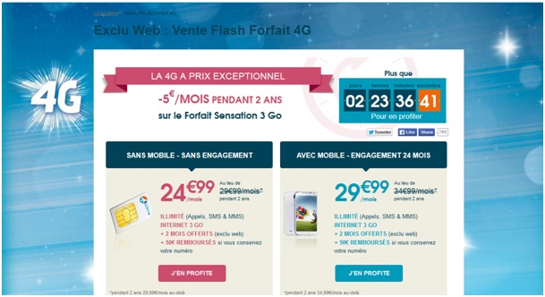 Le forfait Sensation 4G 3Go est également disponible avec un engagement de 24 mois et achat de mobile pour 29.99€/ mois au lieu de 34.99€ grâce à cette vente flash. La durée de cette remise de 5€ par mois s'effectue peandant une période de 2 ans.