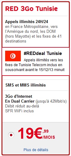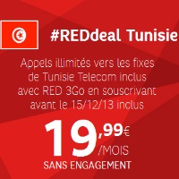 Ce bon plan est réservé aux 5000 premiers clients pour toute nouvelle souscription ou migration clients SFR la Carte vers une offre RED 3Go, entre le 9/12/2013 et le 15/12/2013 à minuit. Les appels sont donc illimités vers les fixes de Tunisie et valables jusqu’au 31/12/2014 (après cette date, les appels seront facturés au tarif en vigueur dans l’offre RED 3Go).