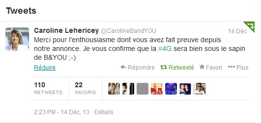 Depuis le 05 décembre, nous attendons avec impatience la date officielle pour le lancement de la 4G. L’opérateur nous a promis au lancement des offres Free, que la 4G sera disponible avant Noël sans nous donné de date précise. Après avoir communiqué par le biais de son blog, cette fois la directrice de B&You, Caroline Lehericey a annoncé sur Twitter ce week-end que l’opérateur intégrera bien la 4G dans ses offres avant Noël et confirme que la 4G sera bien sous le sapin de B&You.