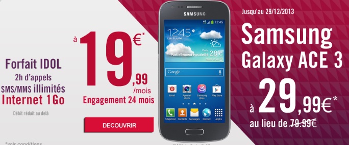 Le Samsung Galaxy Ace 3 est à partir de 79.99€ soit 29.99€ en indiquant le code promo « ACE3 » avec un forfait iDOL M à partir de 13.99€ ou encore avec un forfait bloqué iDOL à partir de 15.99€. La remise est également valable avec les forfaits iDOL S sans engagement avec option mobile à 4€ par mois pendant 24 mois soit à partir de 7.99€ (forfait iDOL S 2h à 3.99€+ option mobile à 4€). Le mobile est à 129.99€ soit 79.99€ à la commande puis 4€ par mois pendant 24 mois sans engagement.